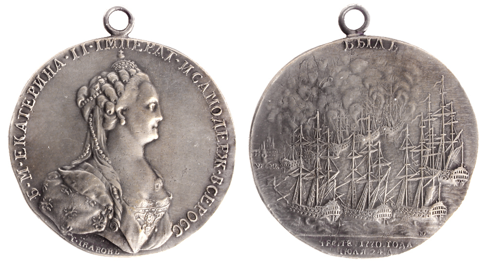 Silver medal, 1770, by T. Iwanov, mounted, 24.28 gr., diameter 39.20mm, ref. Diakov 147.1 . Obv. bust to right, rev. four Russian ships, and in the background burning Turkish ships.