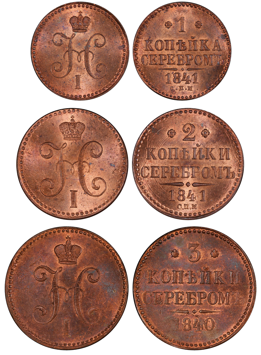 1841 ??? Kopek PCGS MS63RB, 1841 ??? 2 Kop. PCGS MS64RB, 1840 ??? 3 Kop. PCGS MS61RB