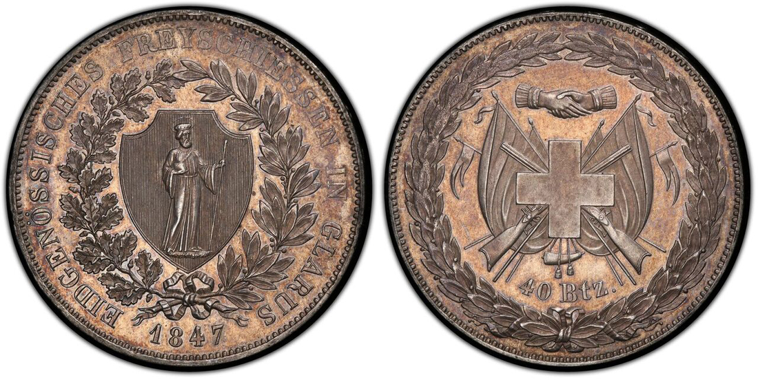 40 Batzen (Thaler), 1847, var. R-803a Glarus, Munich mint, silver, weight 29,5 g., diameter 40 mm. Obv. Saint Fridolin in center, around shield within wreath, legend EIDGENÖSSISCHES FREYSCHIESSEN IN GLARUS, rev. arms of Glarus, underneath date. ref. Dav 373; KM-20