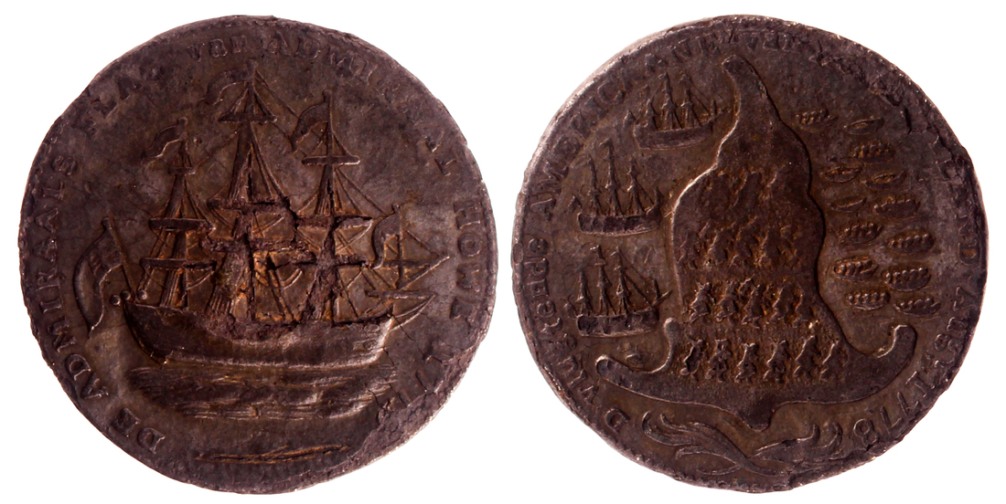 Bronze Ship Token or Medal, 1778-1779, weight 9,36 g, diameter 32mm, unsigned (presumed Dutch origin). Ref.Betts 562. Obv. map Aquidneck, Rhode Island, depicting the American forces retreating from three British ships, with no wreath below ship rev. Admiral Howe's flagship right, without wreath below .