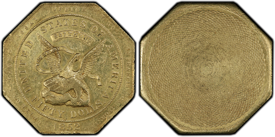 "Californians," "quintuple eagles," "five eagle pieces," or "slugs" - the $50 pieces produced by Augustus Humbert. United States Assayer of Gold in 1851 and 1852.
