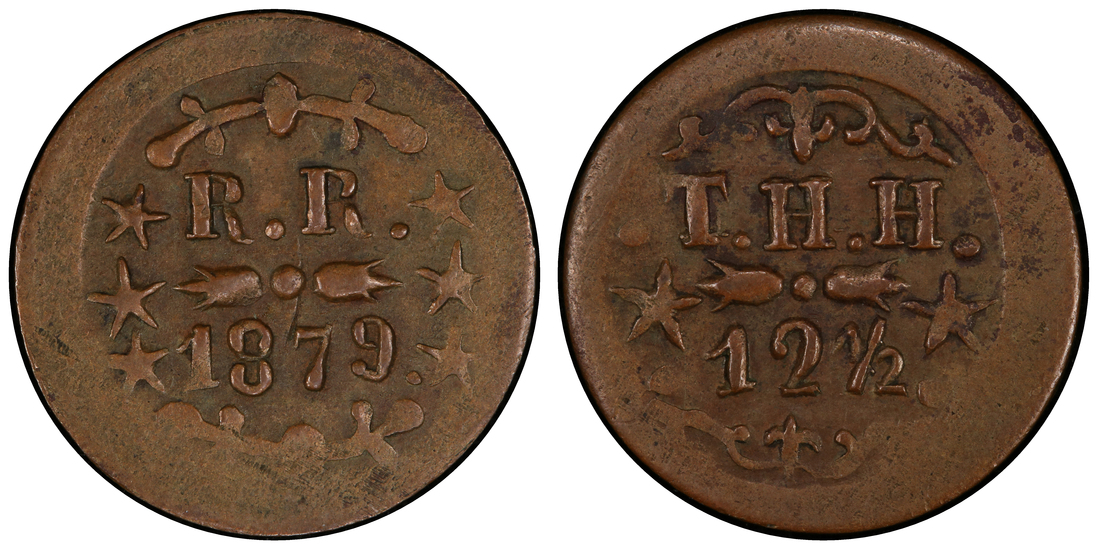 12 1/2 Cents 1879, Kahului-Wailuku, T. Hobron 2/6 Stars, Thin planchet, copper, ref. Medcalf T2-8, BN. Obv. 6 stars and double wreaths, rev 2 stars.