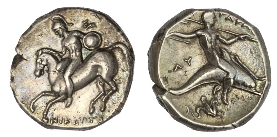Calabria. Tarentum. AR Stater (Didrachm), ca. 302-280 BC. 7.92 gms. Helmeted warrior riding horse left side-saddle, holding small round shield, NIKOTTA(Σ) below, EY above, rev. Phalanthos astride dolphin right, holding small javelin, trident over his shoulder, ΛY behind, hippocamp right below. Vlasto 699, SNG ANS 1075, HN Italy 968. Light iridescent hues. Good Very Fine.