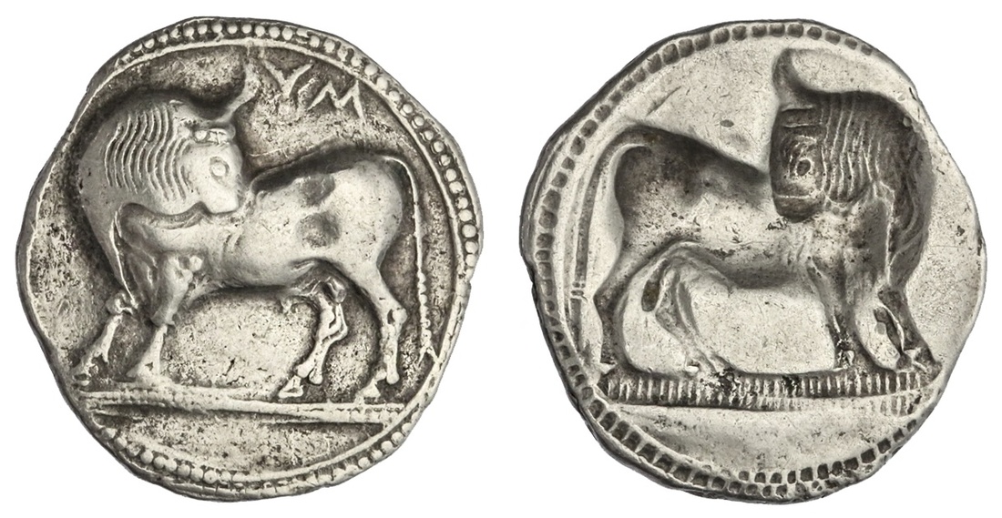 Lucania. Sybaris. AR Stater, ca. 550-510 BC. 8.13 gms. Bull standing left, head reverted, YM above, rev. Incuse bull standing right. HN Italy 1729. Good metal quality. Well-centered. Very Fine.