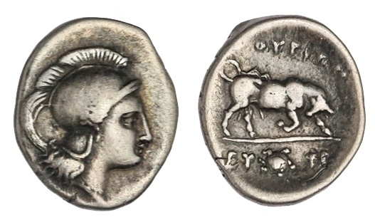 Lucania. Thourioi. AR Triobol, ca. 350-300 BC. 1.10 gms. Head of Athena right, wearing crested Attic helmet adorned with Skylla, rev. (Θ)OYPIΩN, bull butting right, aegis flanked by EY-ΦE in ex. SNG ANS 1168. Medium gray. Very Fine.