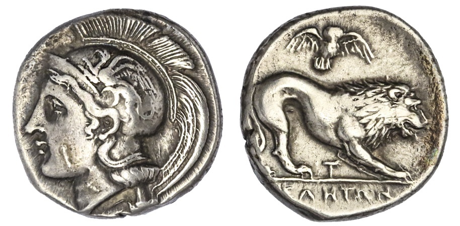 Lucania. Velia. AR Stater, ca. 400-340 BC. 7.60 gms. Athena head left wearing crested Attic helmet adorned with a griffin, rev. Lion crouching right, owl, wings spread, above, T below; (Y)EΛHTΩN in ex. SNG ANS 1287, SNG Lockett 546, BMC 1287. Very Fine.