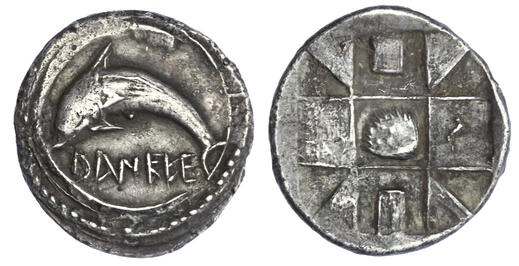 Sicily. Messana (as Zankle). AR Drachm, ca. 500-493 BC. 5.47 gms. Dolphin leaping left, DANKLE below, within sickle-shaped band representing the city's harbor, rev. Nine-part, incuse square with scallop shell at center. SNG ANS 302, SNG Lloyd 1076, Boston MFA 285, Kraay & Hirmer 49. Medium gray tone. Good Very Fine.