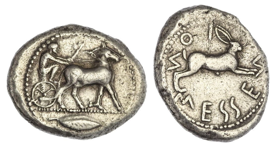 Sicily. Messana. AR Tetradrachm, ca 480-478 BC. 17.25 gms. Biga of mules driven right by charioteer, olive leaf in ex., rev. MESSEN-ION (the Ns reversed), Hare springing right. Caltabiano 75 (D41/R38), SNG Lockett 817 (same obverse die), SNG ANS 315. Horizontally ovoid flan. Lightly toned. Good Very Fine. Ex CNG Auction 64, Sept. 24, 2003, lot 54.