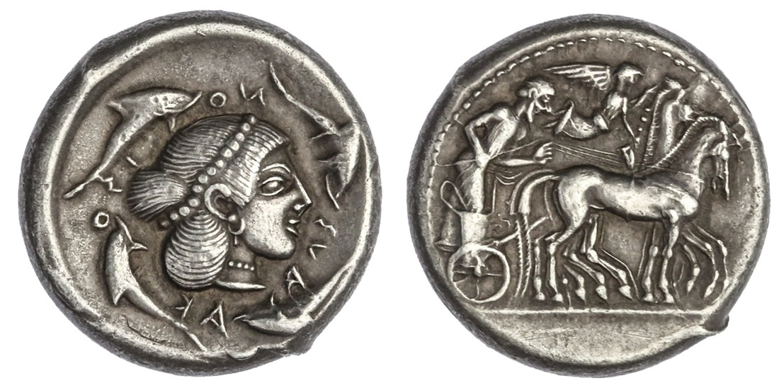 Sicily. Syracuse. Deinomenid Tyranny (485-466 BC). AR Tetradrachm, struck under Hieron, ca. 478-475 BC. 17.35 gms. Quadriga driven right by charioteer, Nike flying above to crown horse, rev. EVR-AK-oΣI-ON (the last N reversed, the R and A upside down), Head of Arethusa right wearing pearl tainia, hoop earring with single pendant and pearl necklace, four dolphins around. Boehringer 296 (V142/R204). Pleasing archaic style. Near Extremely Fine.