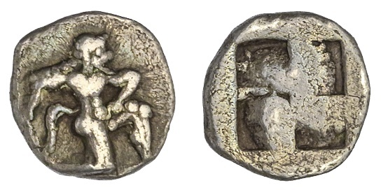 Islands off Thrace. Thasos. AR Diobol, ca. 500-480 BC. 1.09 gms. Ithyphallic satyr running right, rev. Quadripartite incuse square. Le Rider Thasiennes 4. Very Fine.