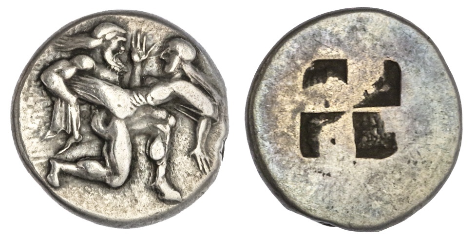 Islands off Thrace. Thasos. AR Stater, ca. 463-449 BC. 9.15 gms. Satyr running right, carrying protesting nymph; the design exhibiting elements of archaic giving way to classical, rev. Quadripartite incuse square. Le Rider Thasiennes 5, SNG Copenhagen 1010-1011. Pleasing transitional style. Lightly toned. Good Very Fine.
