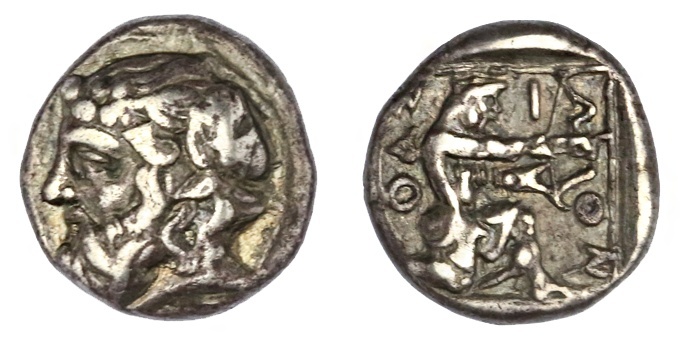 Islands off Thrace. Thasos. AR Drachm, ca. 411-340 BC. 3.78 gms. Head of Dionysos left, bearded and ivy-wreathed, rev. ΘAΣ-I-ON, Herakles clad in lion's skin, kneeling right, drawing bow, cicada below his outstretched arm, in linear square, all in circular incuse. West 5. Rare. Very Fine.