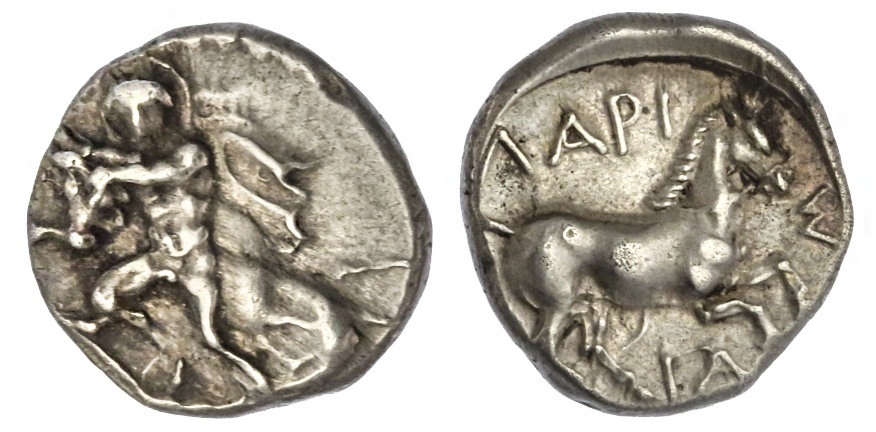 Thessaly. Larissa. AR Drachm, ca. 420-400 BC. 6.00 gms. Youth, chlamys trailing, head facing ¾, wrestling bull left, rev. ΛAPI-ΣAI (partially reversed), bridled horse galloping right, trailing reins. Hermann p. IV, 1; SNG Copenhagen 113. Lightly toned. Very Fine.