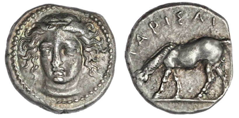 Thessaly. Larissa. AR Drachm, ca. 405/0-370 BC. 6.11 gms. Head of the nymph Larissa facing ¾ left, hair floating freely, wearing taenia, within beaded circle, rev. ΛAPIΣAI, Horse grazing left, with short forelegs and shoulders lower than rump. Lorber-Shahar type 1, (O6/R8). Bold portrait, well-centered. Lovely lavender gray with soft iridescent hues. Near Extremely Fine.