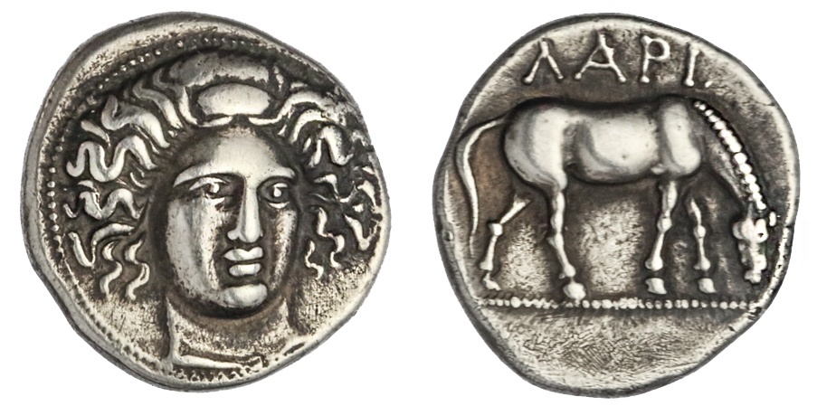 Thessaly. Larissa. AR Drachm, ca. 400-380 BC. 5.81 gms. Head of the nymph Larissa facing ¾ right, hair in ampyx rev. ΛAPI, horse grazing right on beaded exergual line. Lorber-Shahar type 21 (O87/R6) = Lorber Early 71, Hermann pl. VIII, 4; SNG Delepierre 1130. Well-centered. Rich, deep gray. Good Very Fine.