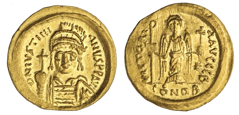 Byzantine Empire. Justinian (527-556). AV Solidus, struck 542-552. Constantinople, Second Officina. 4.48 gms. DN IVSTINI-ANVS PP AVG, helmeted and cuirassed bust facing slight left, holding globus cruciger and shield decorated with horseman, rev. VICTORI-AAVCCCB, angel standing facing holding globus cruciger and staff surmounted by Staurogram, star in right field, CONOB in ex. DOC 9i, MIBE 7, SB 140. Lustrous and About as Struck.