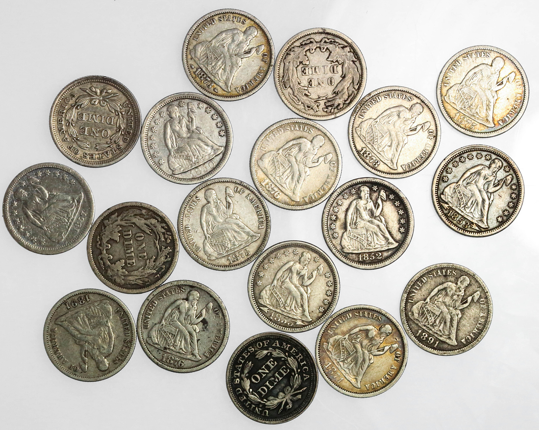 Pleasing Seated Liberty Dime Assortment, 1850s to 1890s. 1850 EF; 1852 EF; 1853 Arrows EF; 1853 Arrows EF; 1854 Arrows EF; 1855 Arrows EF; 1856 EF, dark; 1860 VF; 1871 EF; 1873-CC EF; 1873 Closed 3 EF; 1873 Arrows EF; 1874 Arrows EF; 1875 VF; 1876 VF; 1876-CC VF details, minor stains; 1891 VF-EF; 1891-O VF. Should be seen. Sold as is, no returns. [18]