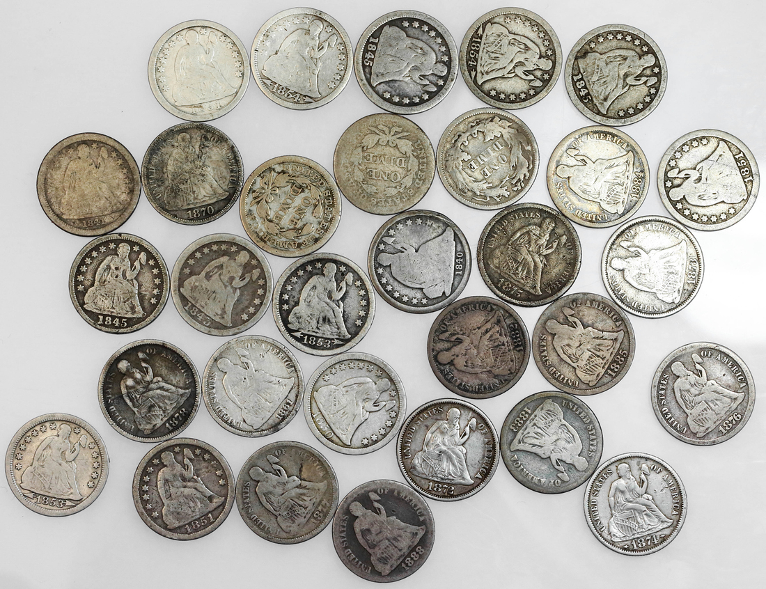 Nice group of Seated Liberty Dimes. 1840s to 1890s. 1840-O No Drapery About Good; 1841 Good; 1843 Good; 1845 Good; 1845 VG; 1845-O Good; 1850 VG-Fine; 1851 Good; 1851 VG; 1851-O Good; 1852 About Good; 1853 Arrows VG(2); 1853 Arrows Fine; 1854 Arrows VG(2); 1861 Good, pits; 1870 Fine; 1872 EF detail, scratches; 1873 Closed 3 VG; 1873 Arrows, VF detail, scratches; 1874 Arrows, VF details, pits in the fields; 1875 Fine details, surface problems; 1876-CC VG; 1877 AG; 1878 Fine, dark; 1882 About Good; 1883 About Good; 1884 VG; 1885 VG; 1888 About Good. Should be seen. Sold as is, no returns. [31]