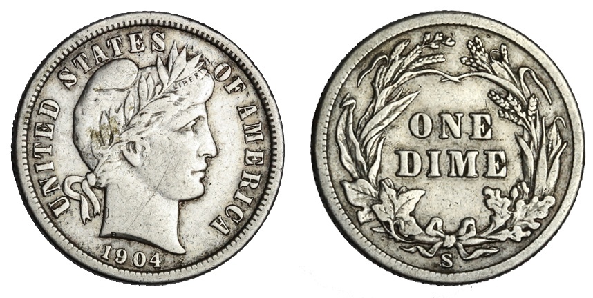 1904-S Barber Dime. Very Fine.