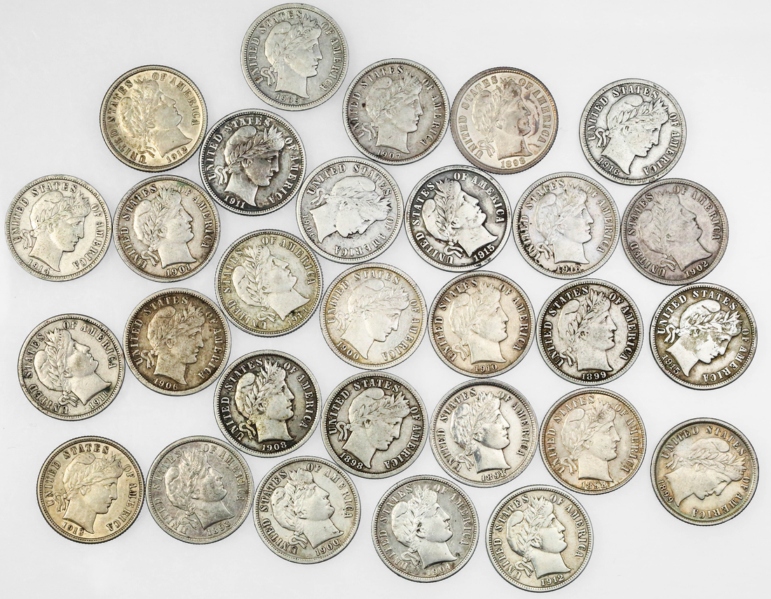 Higher Grade Circulated Barber Dime lot. 1892 through 1916, Some Duplication, Mostly Extremely Fine or So. 1893-S EF; 1898 AU, cleaned; 1898 BU, light scratches; 1898 AU; 1898-S Very Fine; 1899 AU; 1899-S VF-EF; 1900 EF; 1900-S EF; 1901 EF-AU; 1902-S AU, light scratches; 1904 AU; 1906-S EF; 1907 EF; 1908 EF; 1909 EF; 1910-S EF-AU; 1911-D AU; 1911-S EF; 1912 Choice AU; 1912-S EF; 1913 Choice AU; 1914 AU; 1914-D EF-AU; 1915 EF; 1915-S EF; 1916 EF; 1916-S EF; 1916-S EF. Must be seen. Sold as is, no returns. [29]