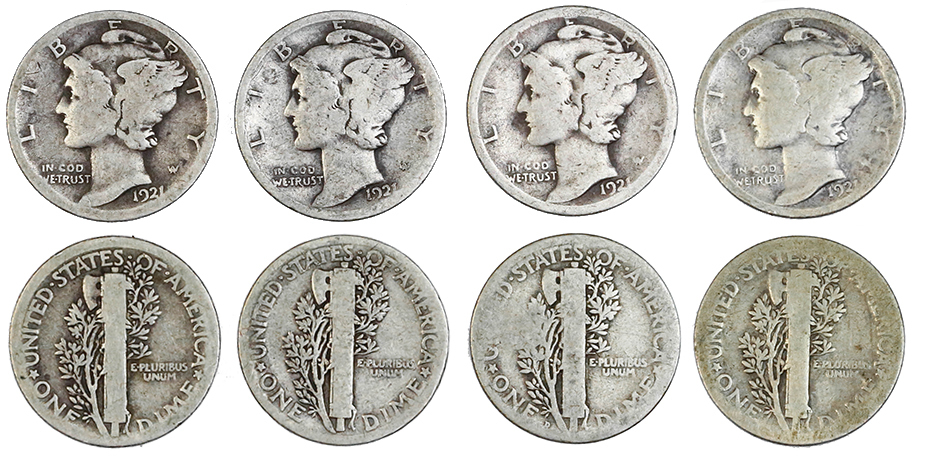 1921 and 1921-D Mercury Dime Quartet. Good to Very Good.