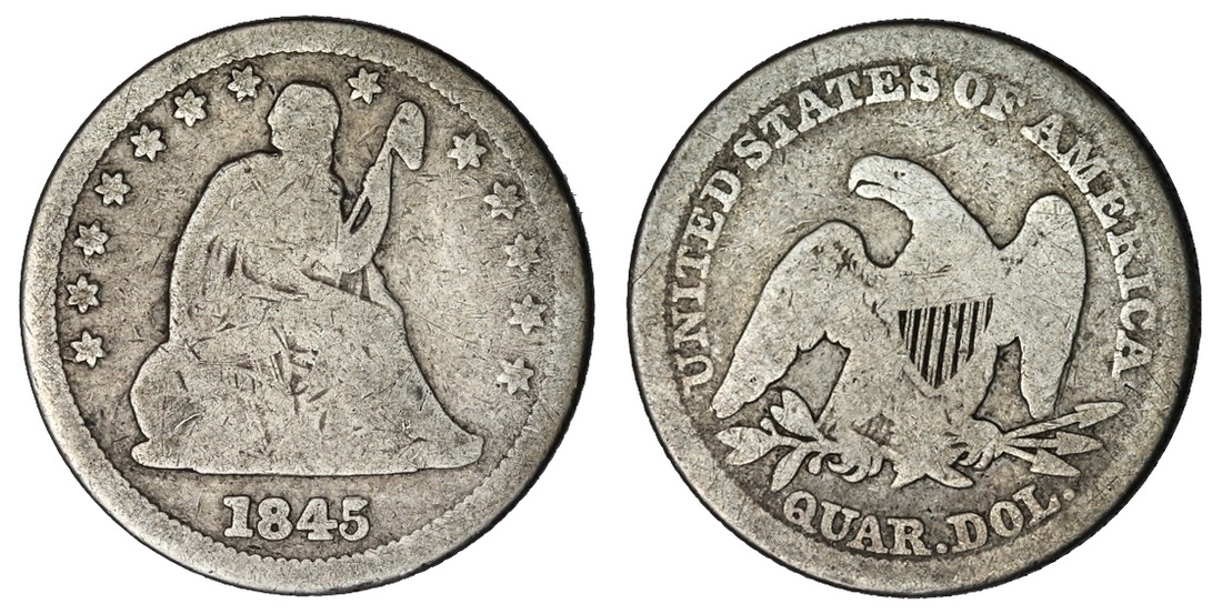 1845 Over 5 Seated Liberty Quarter. Portions of the top of a 5 can be seen above the last digit in the date. Good.