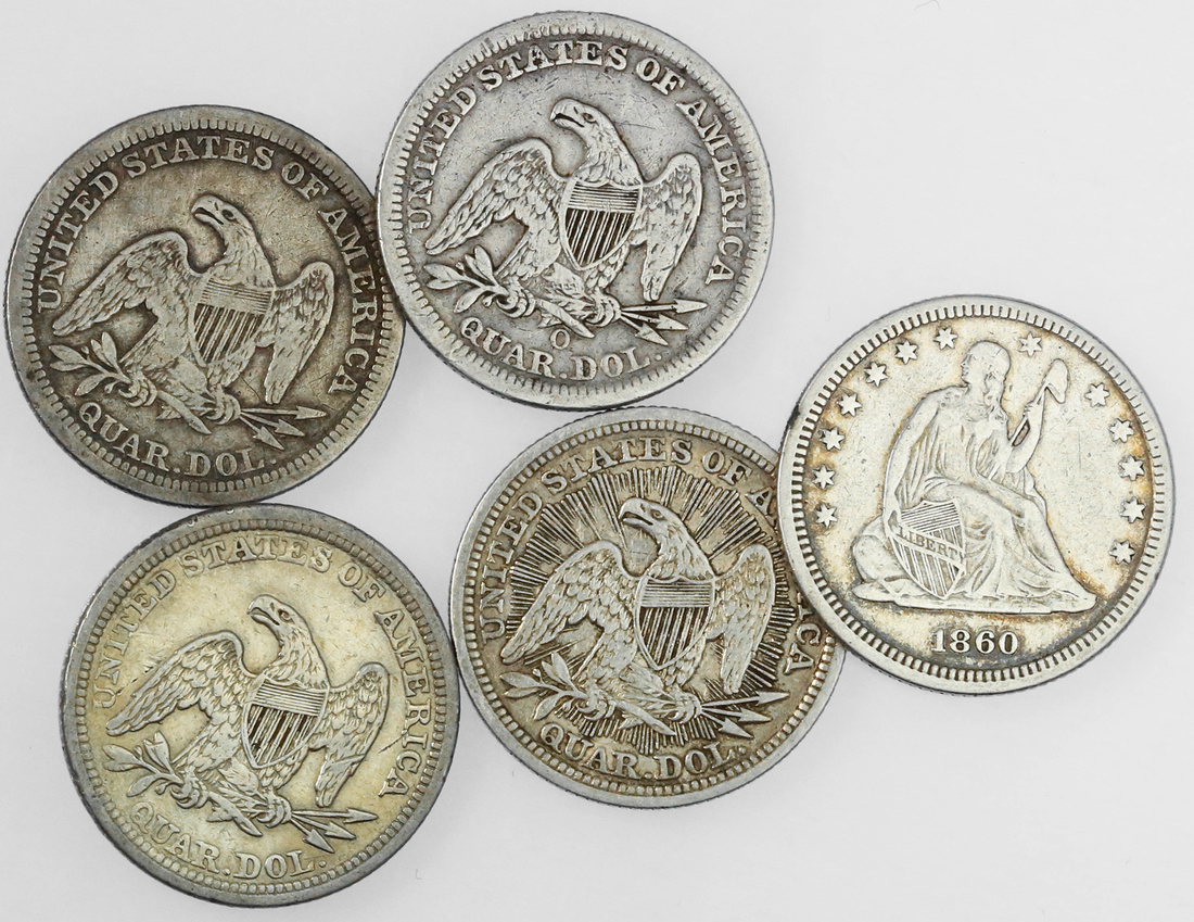 Seated Liberty Quarter Grouping. All Very Fine. 1853 Arrows and Rays; 1854 Arrows; 1857; 1859-O; 1860. [5]