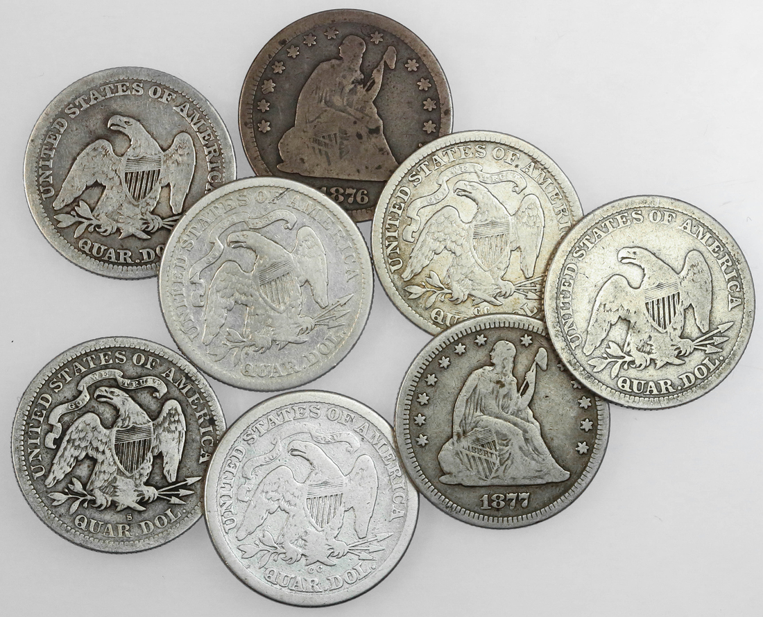 Seated Liberty Quarter Assortment. 1858 About Fine; 1861 About Fine; 1876 Fine; 1876-CC About Good; 1876-CC VG; 1876-CC Fine; 1876-S VF; 1877 Fine. [8]