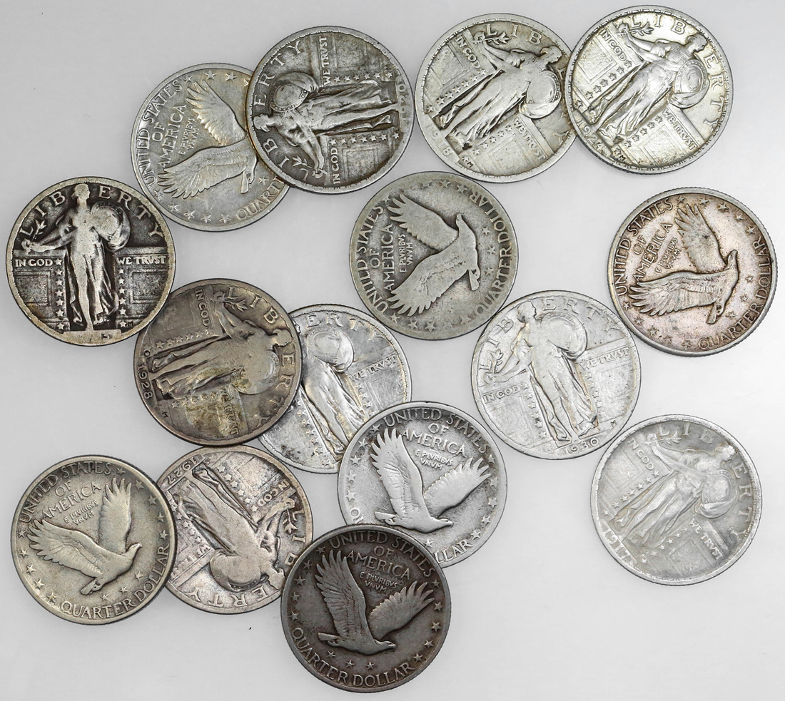 Standing Liberty Quarter Grouping. 1917 Type II EF details, exposure to salt water; 1918 VG; 1920-S Fine; 1923 AG; 1924 EF; 1925 F-VF details, scratch; 1926 Fine; 1927 G-VG; 1927-D VG; 1927-S Good; 1928 Good; 1928-D G-VG; 1928-S VF;1929 VF; 1930 G. [15]