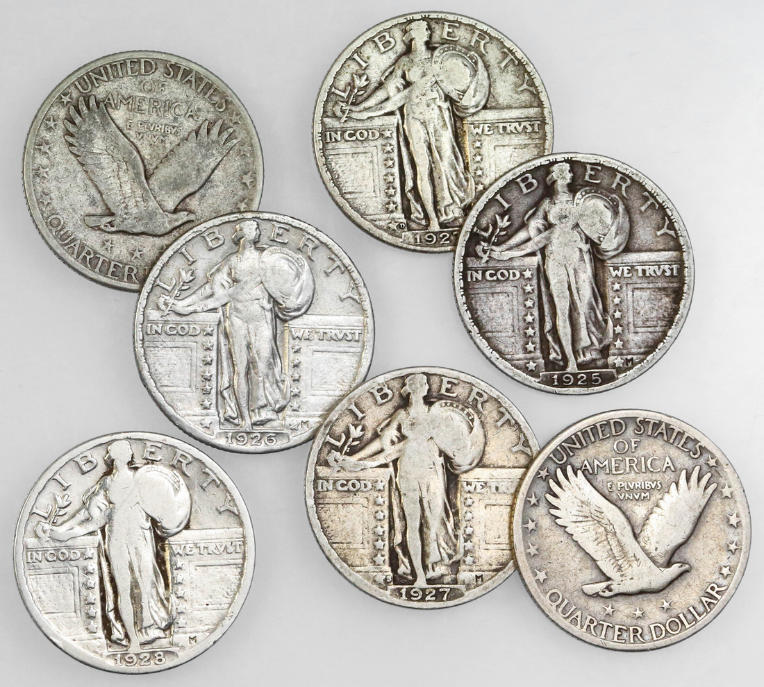 Standing Liberty Quarter Septet. 1925 VG; 1926 VF; 1927-D VF; 1927-S Good; 1928 G; 1929 Good; 1930 VG. [7]
