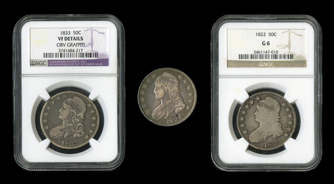 Bust Half Dollar Trio. 1822 NGC G6;1833 NGC VF details, grafitti; 1834 Large Date Small Letters EF; (3)