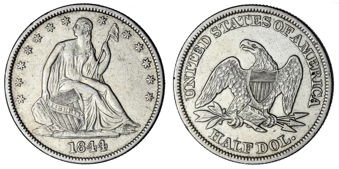 1844 Seated Liberty Half Dollar. EF, lightly cleaned.