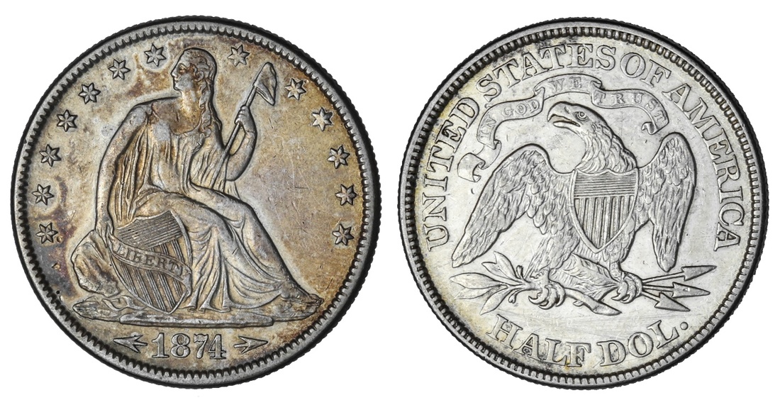 1874 With Arrows Seated Liberty Half Dollar. Almost Uncirculated details. Some light hairline scratches on the reverse.