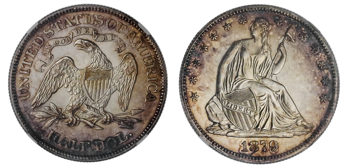 1879 Proof Liberty Seated Half Dollar. NGC PF65. A lovely example with rosé and tungsten-blue highlights.