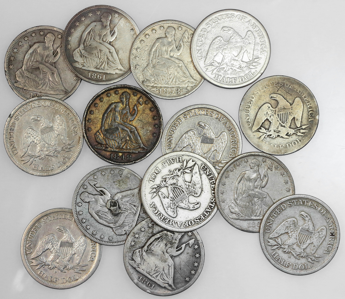 A Large Assortment of Seated Liberty Half Dollars, All with Defects. 1843 VF details; 1848 EF details; 1853 Arrows VG details; 1853-O Arrows VG details; 1859-O Fine details; 1860-O VF details; 1861-O VG details; 1861-S G-VG details; 1861-SbEF details; 1963-S VG details; 1864-S Fine details; 1865AG details; 1865-S Fine details; 1868-S EF details. Some with mounting remnants, rim bruises, cleaned, scratched or otherwise damaged. Bid accordingly. Sold as is, no returns. [14]