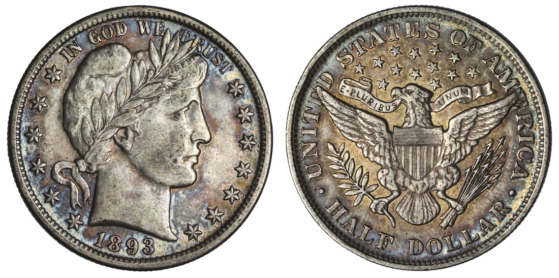 1893 Barber Half Dollar. Almost Uncirculated. Lovely original surfaces with hints of iridescent blue toning.