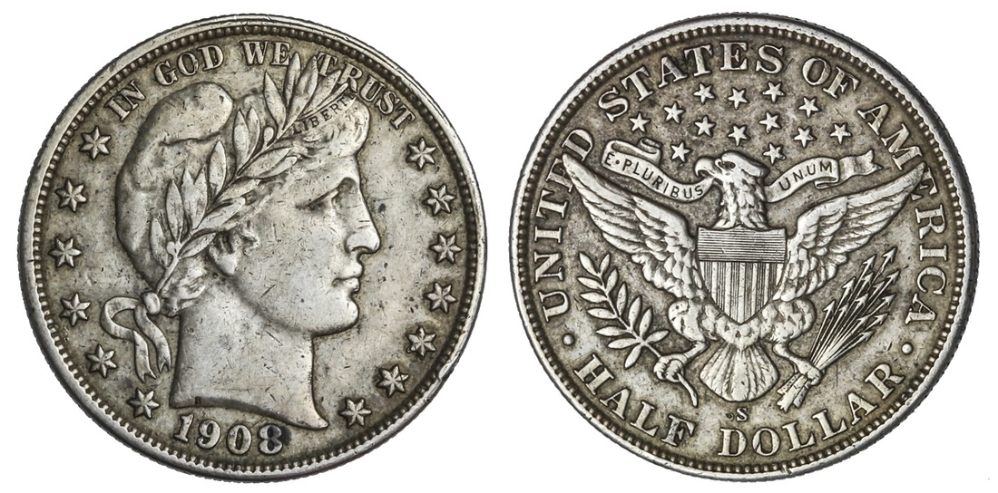 1908-S Barber Half Dollar. Extremely Fine. A small dark spot touches the last digit in the date. Mentioned merely for the sake of accuracy.