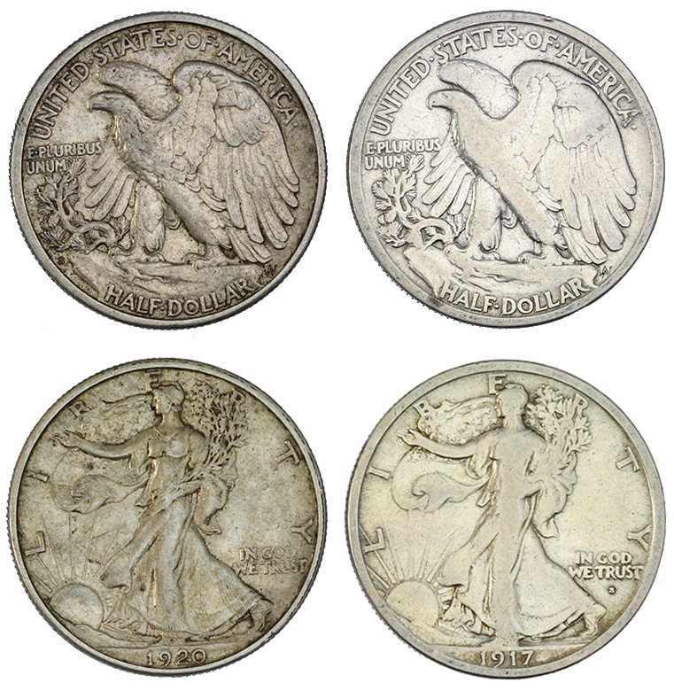 Early Date San Francisco Mint Walking Liberty Half Dollar Pair. 1917-S Obverse Very Good; 1920-S Extremely Fine.