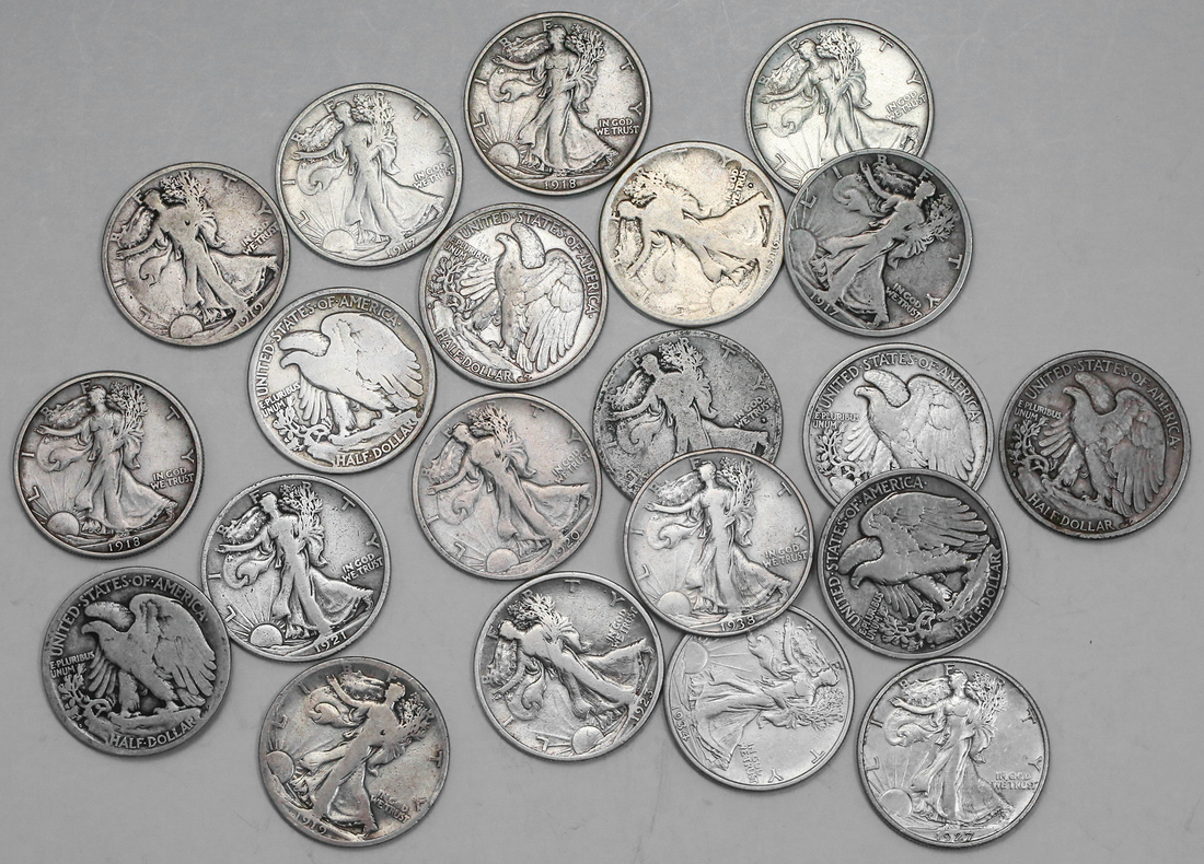 Walking Liberty Half Dollar Assortment. 1916-D Good; 1917-D Obverse G-VG; 1917 EF; 1917-S Reverse Fine; 1917-S Reverse F-VF; 1918 Good; 1918-D VF; 1918-S VF; 1918-S EF; 1919 VG; 1919-S Good; 1920 Fine; 1921-S(2) VG, Fine; 1923-S Fine; 1927-S AU, scratch; 1928-S VF; 1929-S VF-EF; 1933-S VF; 1934-D EF; 1938-D VF details, rim bruises. [21]