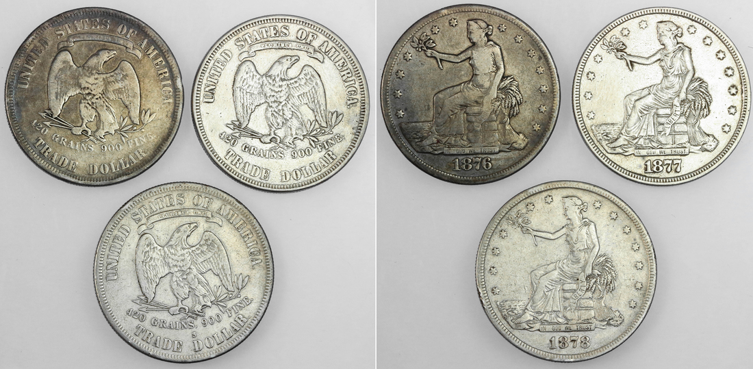 Trade Dollar Trio. 1876 VG, some rim bruises; 1877 and 1878-S, both with VF details, cleaned. (3)