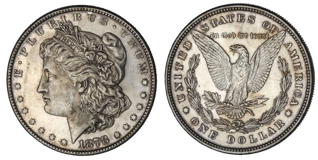 1878 8 Feather Morgan Dollar. Brilliant Uncirculated. Prooflike obverse.