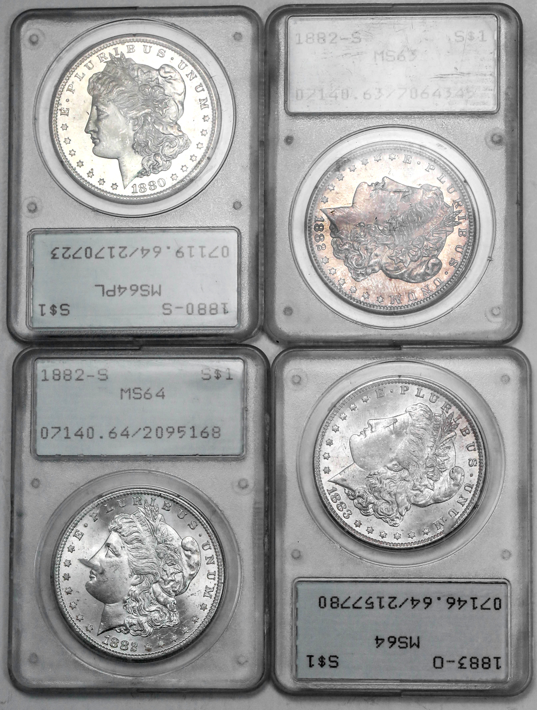 Quartet of PCGS Certified Uncirculated Morgans. 1880-S MS 64PL; 1882-S MS 63; 1882-S MS 64; 1883-O MS 64. [4]