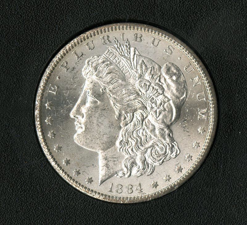1884-CC Morgan Dollar. Uncirculated. In the original government packaging. Some bag marks are readily apparent.