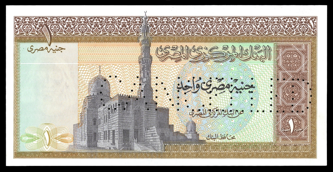 Egypt. Central Bank of Egypt. £1. 1967 to 1978. P-44s. Brown and black on multicolor. Sultan Qaitbey mosque. Ahmad Ibn Tulun mosque, right. Archaic statues on the back. CANCELLED is spelled out with pin cancels. 32 is stamped on the back near the right margin. Almost Uncirculated.