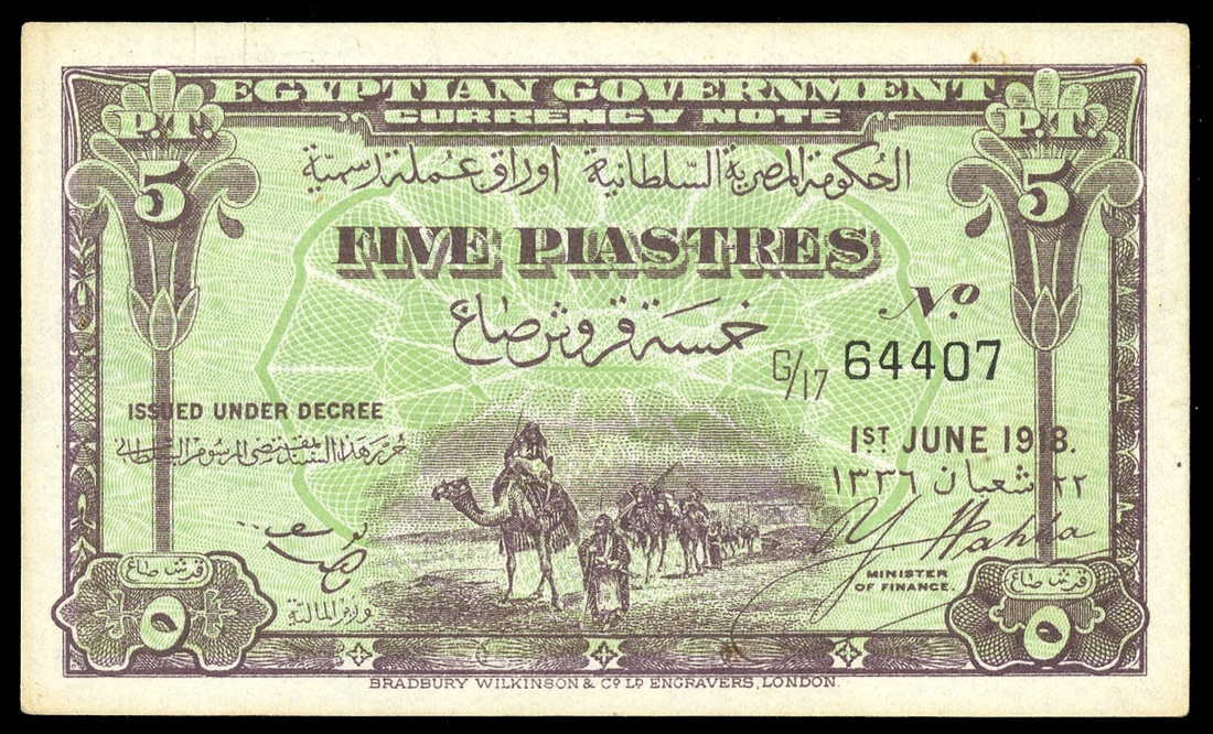 Egypt. Egyptian Government. 5 Piastres. P-162. June 1, 1918. No date. Lilac-brown on green. Caravan. Blue back. No. G/17 64407. EF-AU.