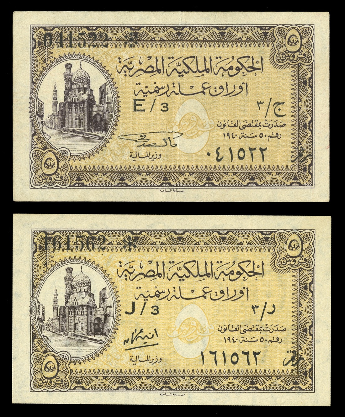 Egypt. Egyptian Government. 5 Piastres. No date. P-164. No. 161562. Series letter J/3. Brown on yellow. Amir Khayrbek mosque left. Blue-gray back. Uncirculated. Also included is an EF example, Series letter E/3. (2)