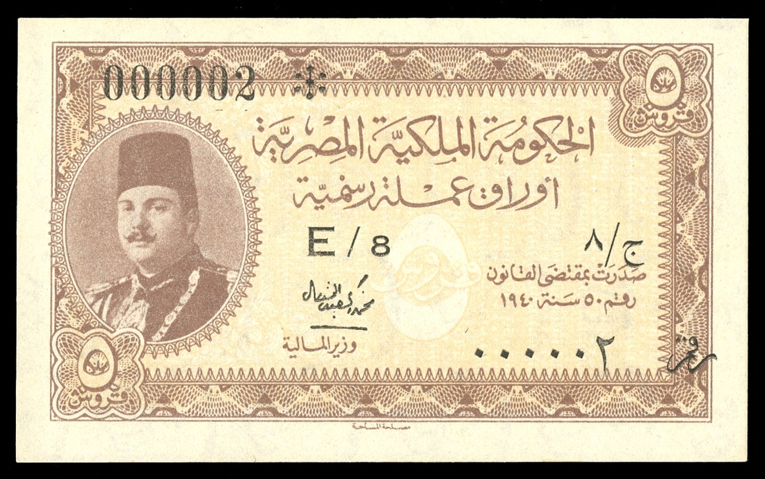 Egypt. Egyptian Government. 5 Piastres. No date. P-165a. Low serial No. 000002. Series letter E/8. Brown on yellow. King Farouk, right. Blue-gray back. Almost Uncirculated.
