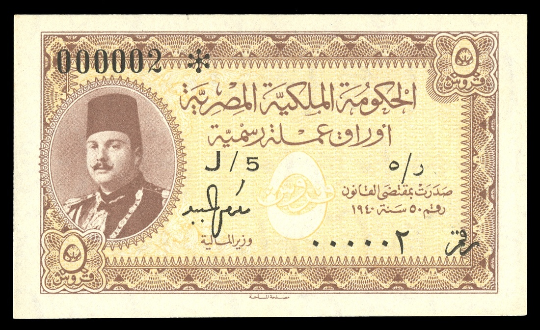 Egypt. Egyptian Government. 5 Piastres. No date. P-165a. Low serial No. 000002. Series letter J/5. Brown on yellow. King Farouk, right. Blue-gray back. Uncirculated.