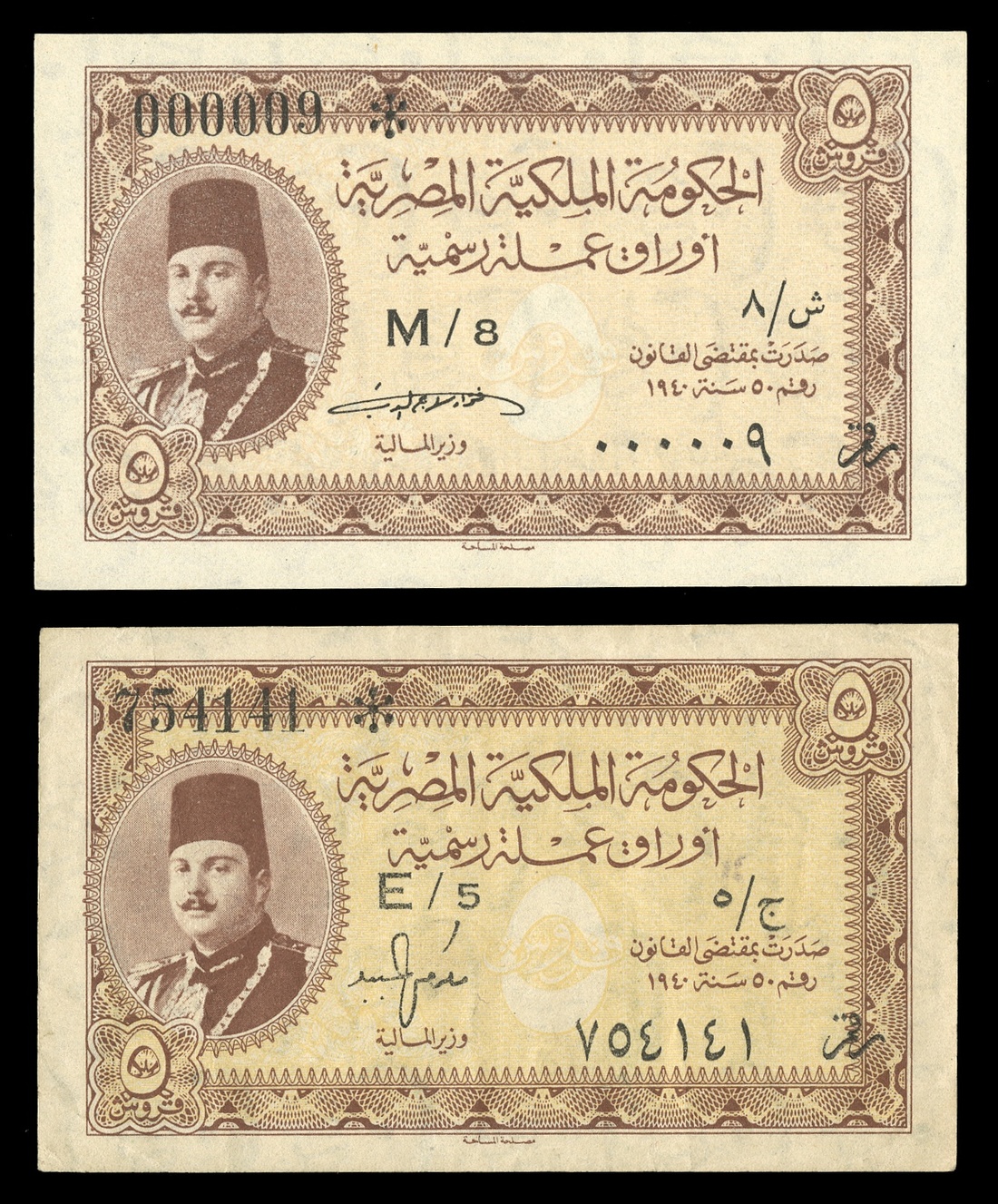 Egypt. Egyptian Government. 5 Piastres. No date. P-165a. Low serial No. 000009. Series letter M/8. Brown on yellow. King Farouk, right. Blue-gray back. Uncirculated. with a hint of age toning. Also included is a second example, Series letter E/5 EF. (2)