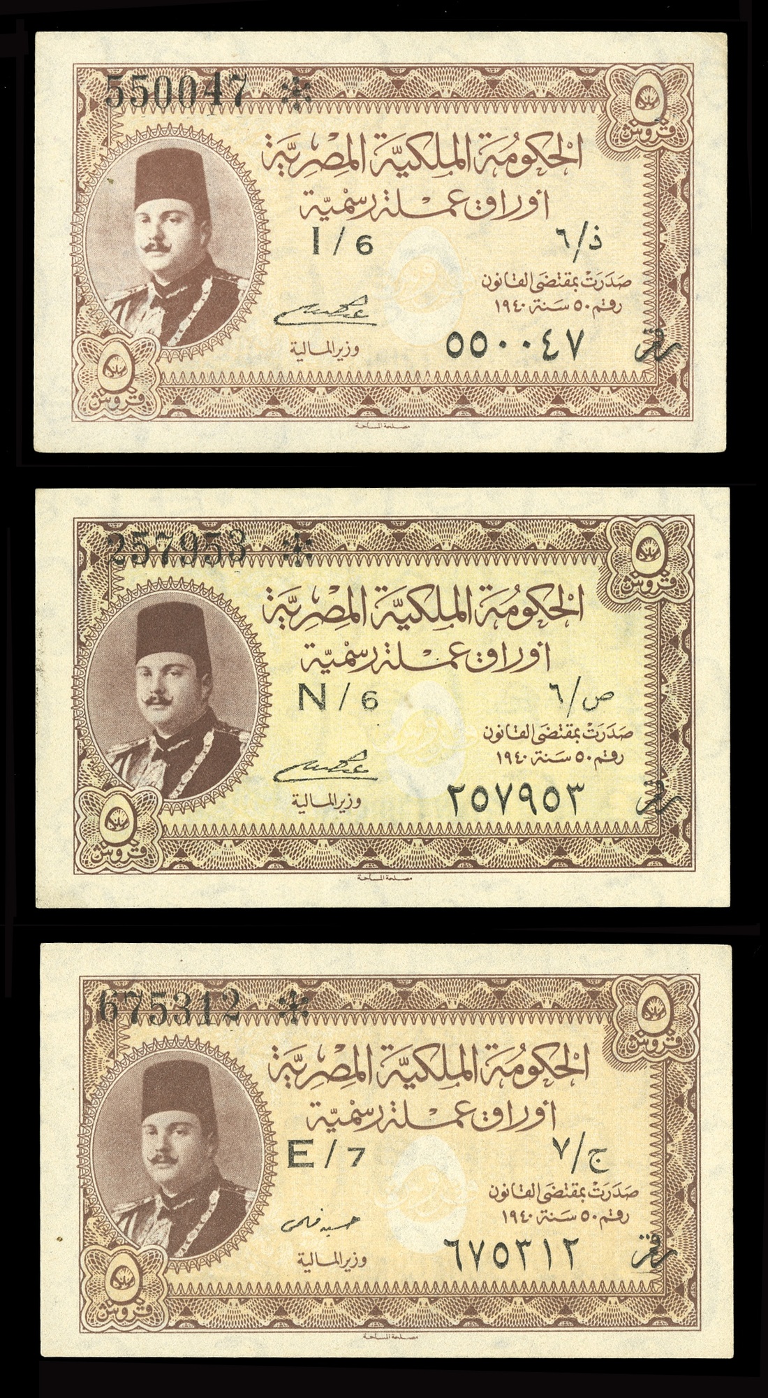 Egypt. Egyptian Government. Trio of P-165a 5 Piastres. No date. Series letters E/7, N/6 and I/6. Brown on yellow. King Farouk, right. Blue-gray back. All are Uncirculated. (3)